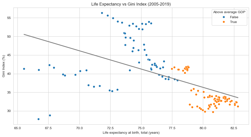 dlf=dl[~dl['Year'].isin(['2024', '2023', '2022', '2021', '2020'])]plt.figure(figsize=(12, 6))sns.scatterplot(data=dlf, x='Life expectancy at birth, total (years)', y='Gini index', hue='Wealthy', palette='tab10')sns.regplot(data=dlf, x='Life expectancy at birth, total (years)', y='Gini index', color='grey', scatter=False, ci=None)plt.title('Life Expectancy vs Gini Index (2005-2019)')plt.xlabel('Life expectancy at birth, total (years)')plt.ylabel('Gini Index (%)')plt.legend(title='Above average GDP', loc='upper right')plt.show()