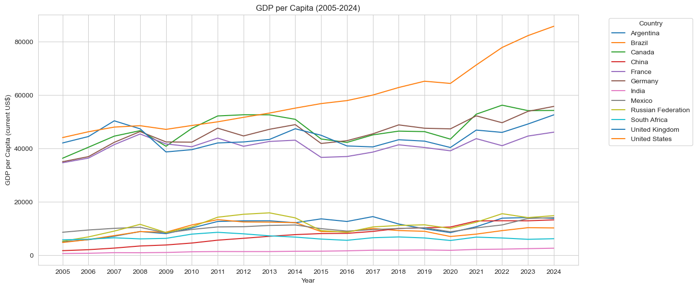 plt.figure(figsize=(12, 6))sns.lineplot(data=dt, x='Year', y='GDP per capita (current US$)', hue='Country Name', palette='tab10')plt.title('GDP per Capita (2005-2024)')plt.xlabel('Year')plt.ylabel('GDP per Capita (current US$)')plt.tight_layout()plt.legend(title='Country', bbox_to_anchor=(1.05, 1), loc='upper left')plt.show()