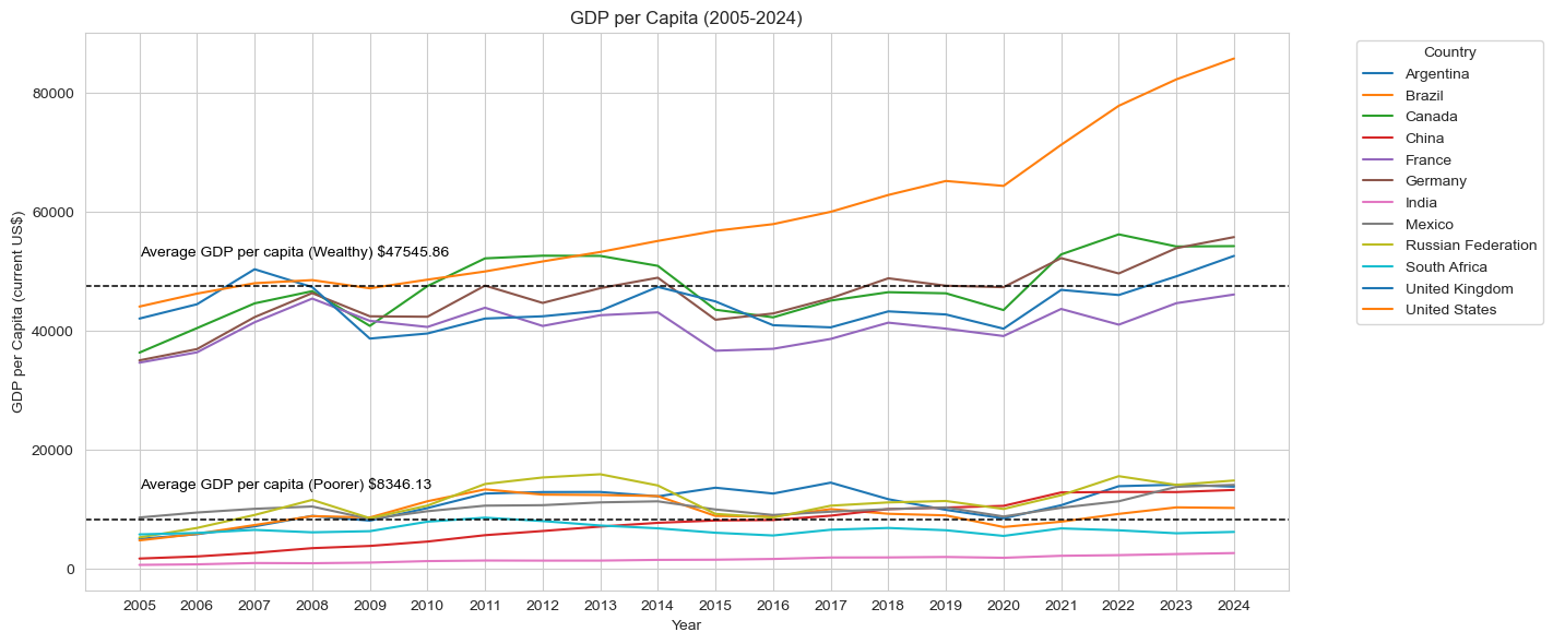 dy=dt.groupby('Country Name')['GDP per capita (current US$)'].mean()filter=dy[dy>dy.mean()]dt['Wealthy']=dt['Country Name'].isin(filter.index)wdy=dt.groupby('Wealthy')['GDP per capita (current US$)'].mean()plt.figure(figsize=(12, 6))p=sns.lineplot(data=dt, x='Year', y='GDP per capita (current US$)', hue='Country Name', palette='tab10')p.axhline(y=wdy[0], color='black', linestyle='--', linewidth=1.1)p.axhline(y=wdy[1], color='black', linestyle='--', linewidth=1.1)p.text(x='2005', y=wdy[0]+7000, s='Average GDP per capita (Poorer) $'+str(round(wdy[0], 2)), color='black', va='top')p.text(x='2005', y=wdy[1]+7000, s='Average GDP per capita (Wealthy) $'+str(round(wdy[1], 2)), color='black', va='top')plt.title('GDP per Capita (2005-2024)')plt.xlabel('Year')plt.ylabel('GDP per Capita (current US$)')plt.tight_layout()plt.legend(title='Country', bbox_to_anchor=(1.05, 1), loc='upper left')plt.show()