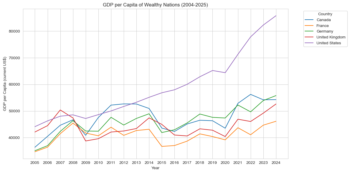 dy=dt.groupby('Country Name')['GDP per capita (current US$)'].mean()filter=dy[dy>dy.mean()]dt['Wealthy']=dt['Country Name'].isin(filter.index)filtered_dt=dt[dt['Wealthy']==True]plt.figure(figsize=(12, 6))sns.lineplot(data=filtered_dt, x='Year', y='GDP per capita (current US$)', hue='Country Name', palette='tab10')plt.title('GDP per Capita of Wealthy Nations (2004-2025)')plt.xlabel('Year')plt.ylabel('GDP per Capita (current US$)')plt.legend(title='Country', bbox_to_anchor=(1.05, 1), loc='upper left')plt.tight_layout()plt.show()