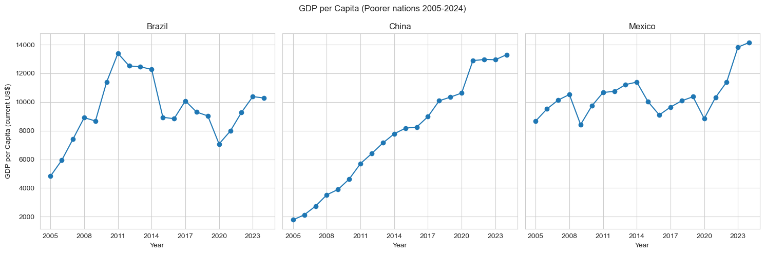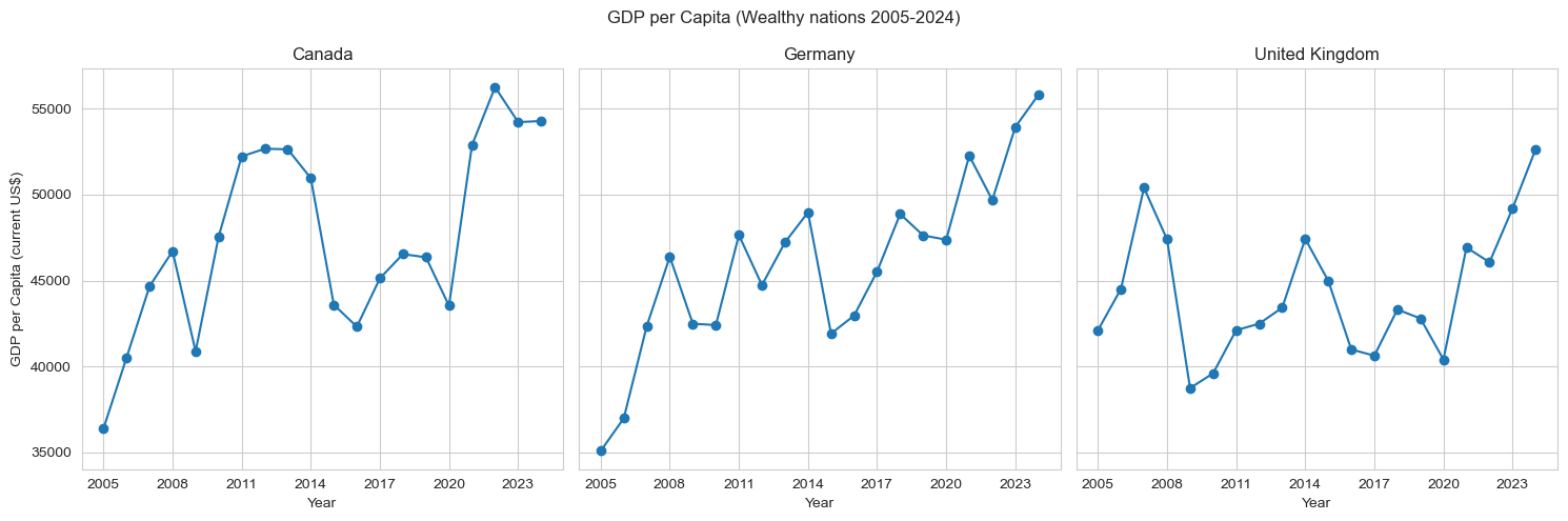 wc=dt[dt["Country Name"].isin(["Germany", "Canada", "United Kingdom"])]pc=dt[dt["Country Name"].isin(["China", "Mexico", "Brazil"])]i=0fig, axes=plt.subplots(1, 3, figsize=(15, 5), sharey=True)for c in wc['Country Name'].unique(): cur=wc[wc['Country Name']==c] axes[i].plot(cur['Year'], cur['GDP per capita (current US$)'], marker='o') axes[i].set_xticks(cur['Year'][::3]) axes[i].set_title(c) axes[i].set_xlabel("Year") axes[0].set_ylabel("GDP per Capita (current US$)") i+=1fig.suptitle('GDP per Capita (Wealthy nations 2005-2024)')plt.tight_layout()plt.show()i=0fig, axes = plt.subplots(1, 3, figsize=(15, 5), sharey=True)for c in pc['Country Name'].unique(): cur=pc[pc['Country Name']==c] axes[i].plot(cur['Year'], cur['GDP per capita (current US$)'], marker='o') axes[i].set_xticks(cur['Year'][::3]) axes[i].set_title(c) axes[i].set_xlabel("Year") axes[0].set_ylabel("GDP per Capita (current US$)") i+=1fig.suptitle('GDP per Capita (Poorer nations 2005-2024)')plt.tight_layout()plt.show()