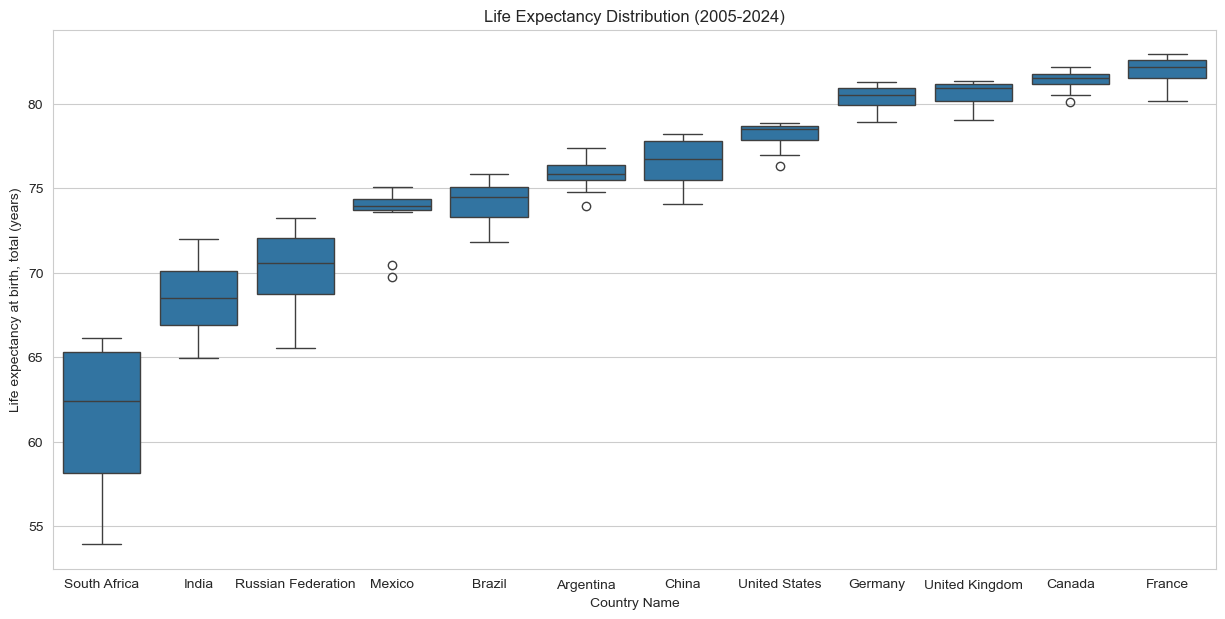 dl=dt.sort_values('Life expectancy at birth, total (years)')plt.figure(figsize=(15, 7))sns.boxplot(x='Country Name', y='Life expectancy at birth, total (years)', data=dl)plt.title('Life Expectancy Distribution (2005-2024)')plt.show()